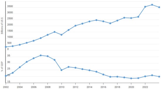 As shown in Figure 3, which presents data organized by the Global Carbon Project (GCP) and processed by Our World in Data, China’s percentage of carbon embedded in product exports reached 20.6% in 2006 and remained at this figure until 2008. The proportion then showed a general upward trend, reaching 8.9% in 2022 [11]. The increase during this period can be roughly attributed to the following reasons: (1) China started clean energy projects and measures to reduce emissions per unit of GDP in 2005; (2) China’s proportion of primary energy has been greatly reduced with the rapid development of low-carbon energy such as hydropower, PV power, wind power generation, and nuclear power; therefore, the proportion of coal-fired thermal power generation has been effectively reduced, and (3) although China’s export output value continued to rise during this period as shown in Figure 4 [12], China’s domestic GDP grew faster. Although the domestic demand-oriented economy has rapidly increased the total amount of carbon emissions embedded in exports, domestic demand consumption has grown even faster.
