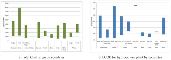 Total installed hydropower cost ranges and levelized cost of electricity (LCOE) for hydropower plants by country and region; comparison based on the Irena report, 2010. Note: the assumptions on capital costs, capacity factors, O&M costs, lifetimes, and discount rates differ [19,20,21].