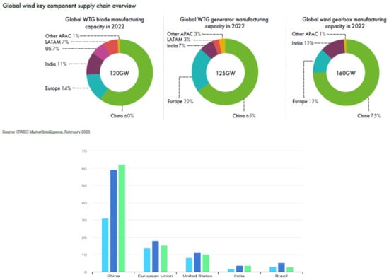Global Wind Energy Council (GWEC) Market Intelligence has been monitoring the supply chain for key wind turbine components since 2019. Based on the latest supply chain update, no bottlenecks are expected in 2023–2024 for key components such as blades and generators; however, further investment in both components is needed to accommodate growth [28]. It is also important to note that the supply chain for key components is highly dependent on China, as shown in Figure 10. In addition to gearboxes and generators, China controls the global supply chain for castings, forgings, slewing bearings, towers, and flanges, with a global market share exceeding 70% [28].