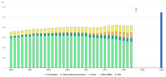 - IEA. Nuclear Power Capacity by Country or Region in the Net Zero Scenario, 1990–2030; IEA: Paris, France, 2023; Available online: https://www.iea.org/data-and-statistics/charts/nuclear-power-capacity-by-country-or-region-in-the-net-zero-scenario-1990-2030-2 (accessed on 1 March 2025).