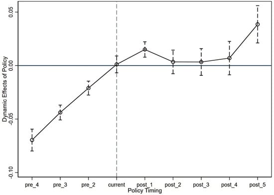 Before constructing the econometric model, this study takes the first batch of carbon emission trading pilot policies in 2011 as the research object and uses the independent-samples T-test method to conduct a preliminary analysis of the policy effects. The empirical results in Table 4 show that before the implementation of the policy, for the intervention group and its counterpart, there is a significant difference in the green economic efficiency of the control group (T value = −5.322, p < 0.01); after the implementation of the policy, the efficiency of the intervention group significantly increases to 0.333, and the significance of the difference with the control group is significantly reduced (T value = −1.569). This shows that the carbon emission trading policy effectively narrows the efficiency gap between pilot cities and non-pilot cities, which verifies the effectiveness of policy intervention, and we can build a model to study the specific causal effects and paths between the two.