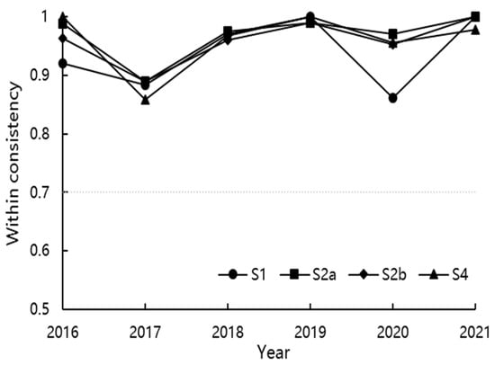 An analysis of inter-group consistency across various histogram paths over the years (Figure 2) reveals that, overall, the consistency level for each histogram exceeds 0.7, with the values consistently around 0.9 from 2016 to 2021. The fluctuation is minimal, indicating benign deviations. The between-group analysis compensates for the lack of cross-sectional data groupings over time, demonstrating that the four groupings maintain strong explanatory power for the sample cases from 2016 to 2021. The decline in collective magnitude in 2017 and 2020 can be attributed to the 2015 revision of the People’s Republic of China Environmental Protection Law, which mandates environmentally friendly standards for the siting and construction of livestock and poultry farms. The same year saw the introduction of the National Plan for Sustainable Agricultural Development (2015–2030), which established regulations for the livestock and poultry farming sectors, including quantitative targets for the comprehensive utilization of waste. These regulations require enterprises to comply with environmental standards, including the installation and operation of pollution control equipment. Increased costs associated with these regulatory requirements, along with the reallocation of funds, may have hindered innovation investments and led to a decline in GTFP [80].