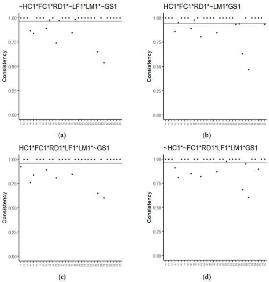 According to the QCA theoretical framework, it is essential to verify the necessity of the antecedent conditions influencing the GTFP of publicly traded companies in the livestock sector before performing the sufficiency analysis. If the overall consistency level of a condition exceeds the threshold of 0.9, it is considered a necessary condition for the outcome. To ensure the reliability of the results, the same test is applied to assess the presence of missing variables (indicated by a ‘~’). In the QCA panel data analysis, an adjusted distance of less than 0.2 indicates a high degree of feasibility for aggregated consistency, serving as a benchmark for evaluation. Conversely, further investigation into the necessity of conditional variables is required, alongside year-to-year variations in panel data, to make a comprehensive judgment [63].