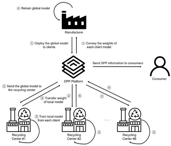 Research on DPPs is actively being conducted across various fields. Heeß [] designed a DPP to support the low-carbon hydrogen market, proposing a solution to ensure data reliability and transparency in the complex hydrogen supply chain while promoting sustainability and decarbonization. Mihai Hulea [] proposed a DPP that integrates Hyperledger Fabric and decentralized identifier technology to enable tracking throughout the entire product lifecycle. Similarly, Koppelaar [] proposed a DPP-based circular supply management system to promote the recycling and reuse of critical raw materials, exploring ways to support a sustainable circular economy through this system. While these papers demonstrate the potential applications of DPPs, they are still limited in that manufacturers merely provide information unilaterally, failing to effectively contribute to the circular economy. To address the limitations of existing studies, this paper proposes a method to bridge the information gap between manufacturers and recycling facilities by integrating federated learning (FL) into the DPP. This approach enables the effective sharing of information about the state and components of discarded products and supports the automation of recycling processes.