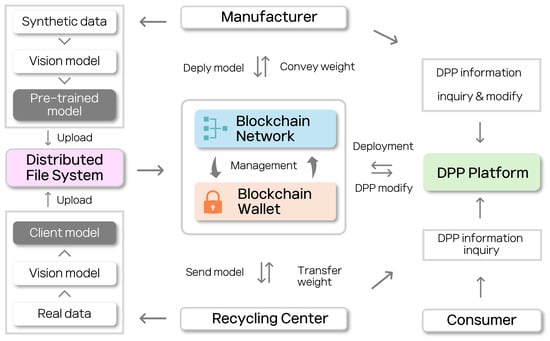 The components of the proposed DPP platform in this paper are primarily composed of manufacturers, recycling centers, and the DPP platform itself. The manufacturer inputs the DPP information, produces a pre-trained model based on the synthetic data, and provides the information that can be used in the recycling process. After receiving the baseline model made by the manufacturer through the DPP platform, the recycling center generates real data about the discarded products with pictures of the waste that arrived at the recycling center and trains the model locally. After that, when the client model is sent to the manufacturer again using the DPP platform, the manufacturer updates the global model using the client model weight and redistributes the model again. This iterative process enables the global model to be retrained based on data collected from the local environments of each recycling center, gradually improving the system’s performance. The DPP platform securely and transparently mediates information and models between manufacturers and recycling centers through blockchain networks and data management systems. Figure 2 shows how the manager and the recycling center exchange information within the platform.