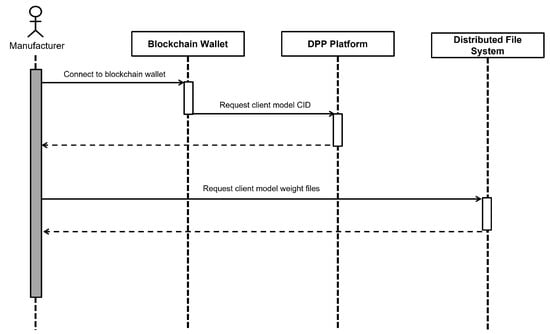 Figure 4 illustrates the process of the manufacturer downloading a client model from the DPP platform. The manufacturer connects to the blockchain wallet to perform user authentication. Then, the manufacturer requests the CID of the client model from the DPP platform. After obtaining the CID, the manufacturer requests the actual weight file associated with the client model from distributed file system. Through this process, the manufacturer can download the model trained locally by the recycling center, i.e., the client.
