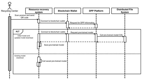 Figure 5 explains the process by which a recycling center downloads the initial and updated global models from the DPP platform. The recycling center scans the product’s QR code in the resource recovery system, connects to the blockchain wallet, and links to the DPP platform. It then requests the DPP information and the pre-trained model. If the model has been updated, the recycling center downloads the updated model. Additionally, if a previously stored model exists in the resource recovery system, that model can also be retrieved.