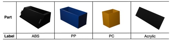 Synthetic data were generated using the Unity Perception package with data annotation techniques, including 2D bounding boxes and semantic segmentation. The materials of each pen holder component were arbitrarily categorized into four types of plastic: Acrylonitrile Butadiene Styrene (ABS) for the main body, Polypropylene (PP) for the blue part, Polycarbonate (PC) for the yellow part, and Acrylic for the nameplate. Figure 7 represents the synthetic data for each component of the pen holder.