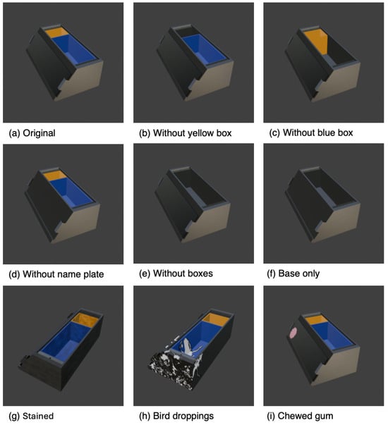 In this study, nine synthetic datasets were created under the assumption of damage or contamination when the product becomes waste. Figure 8 provides examples of the generated synthetic datasets, including six variations where individual components were removed and three contamination types described earlier. The iteration count was set to 100, resulting in each dataset consisting of 100 captured frames per dataset.