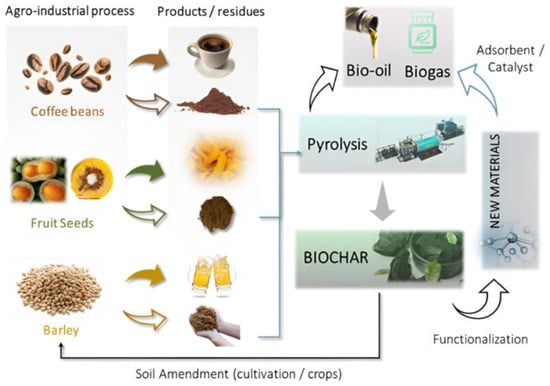 Schematic example of biomass residue recovery and application in producing biochar and new materials [14,16,41,42].