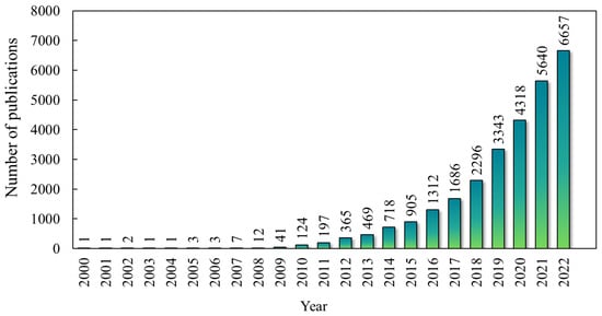 Figure 2 illustrates the number of publications per year. In addition, further refinement of the results can be accomplished through the Web of Science platform, enabling classification based on research fields and the countries with the highest publication rates, alongside various other classifications. The research field most closely associated with biochar is Environmental Sciences/Ecology, boasting 4430 articles. It is closely followed by Agriculture, with 2982 publications, and Engineering, which has contributed 2746 articles to the corpus. Among the countries at the forefront of biochar research, China leads the way with a remarkable 4470 articles, firmly establishing itself as a prominent contributor in this domain.