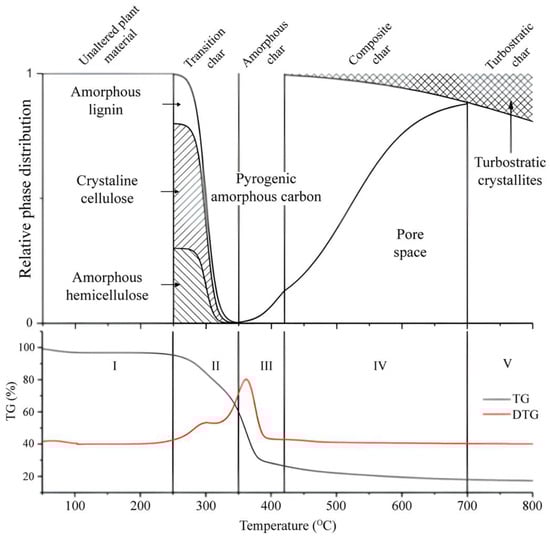 Schematic picture of the main phases of biochar along the thermochemical degradation of eucalyptus biomass, as well as the average yield of ash, volatile materials, and fixed carbon throughout the process. Region I—Unaltered plant material, Region II—Transition char, Region III—Amorphous char, Region IV—Composite char and Region V—Turbostratic char. (adapted [51]).