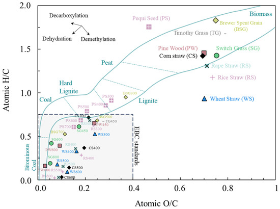Van Krevelen’s diagram of the H/C to O/C ratio (data from Table 4). The gray area represents the EBC standards. Dashed green lines delimits regions of carbonaceous materials.