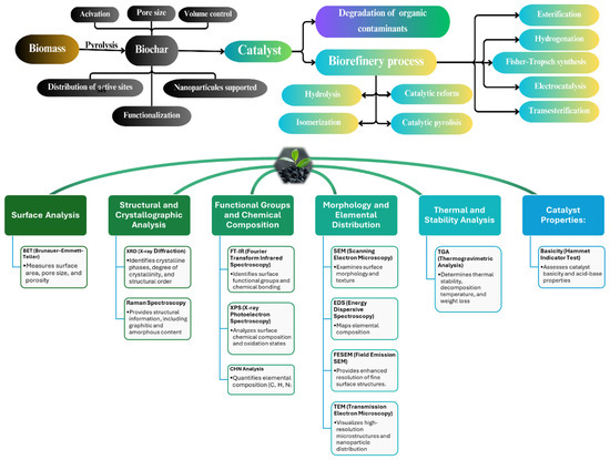 It is essential to highlight that the varied composition of biomasses, which depends on their type and origin, influences the composition of the derived biochar (logically if there is a comparison based on experimental conditions). It is, therefore, vital that the characterization process is conducted for any type of biochar due to the diversity of possible biomasses that have not yet been exploited for this purpose [60]. Thorough characterization of biochar is crucial for understanding its suitability in various applications. Ultimately, the specific characteristics of interest will depend on the intended use, emphasizing the need for tailored characterization.