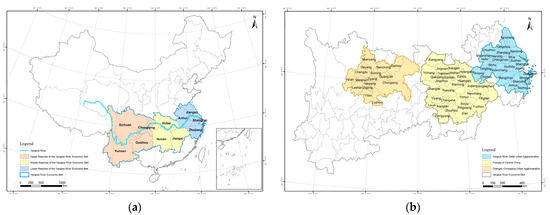 Geographic distribution and scope of the study area. (a) Spatial position of the YREB within China. (b) Delineation and spatial extent of the three major urban agglomerations within the YREB.