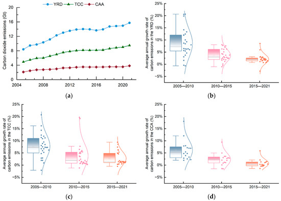 Temporal trends in carbon emissions across the three urban agglomerations (2005–2021). (a) Cumulative carbon emissions growth in the three urban agglomerations from 2005 to 2021. (b) Average annual growth rate of carbon emissions in the YRD. (c) Average annual growth rate of carbon emissions in the TCC. (d) Average annual growth rate of carbon emissions in the CCA.