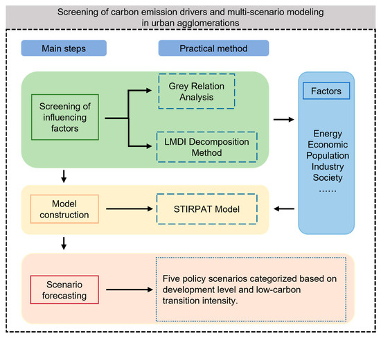 This study focuses on three major urban agglomerations within the YREB as primary research subjects, with particular emphasis on analyzing the determinants and evolving patterns of carbon emissions within these metropolitan regions. To address these limitations, this study presents innovations in research scope, methodology, and analytical framework as follows (Figure 3): (1) we systematically investigate carbon emission determinants across three strategic urban clusters in the YREB (CCA, TCC, and YRD), filling critical research gaps in comparative analysis of watershed economic zones; (2) by synergizing grey relational analysis for objective factor screening with LMDI decomposition, we overcome the subjectivity limitations of conventional qualitative approaches while precisely quantifying historical emission drivers; and (3) we construct the optimized STIRPAT model based on rigorous factor selection, significantly enhancing forecast accuracy through systematic parameter optimization.