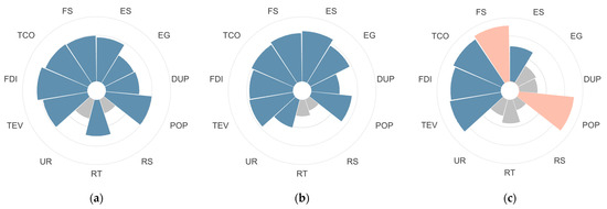 The results of the grey relational analysis conducted on carbon emissions and their influencing factors across the three urban agglomerations reveal distinct regional patterns (Table 2, Figure 4). In the YRD, the correlation coefficients between carbon emissions and UR as well as RS are 0.4125 and 0.3578, respectively, indicating relatively weak associations. Conversely, the remaining factors exhibit statistically significant correlations, ranked in descending order as follows: FDI > TCO > POP > FS > TEV > ES > RT > DUP > EG. In the TCC, the correlation coefficients between carbon emissions and both RS and RT are below 0.5 (0.3274 and 0.3770, respectively), suggesting that industrial structure is not a primary determinant of carbon emission variations in this region. Among the remaining factors, ES demonstrates the strongest correlation with carbon emissions, with a coefficient of 0.7448. Within the CCA, ES, POP, TEV, FDI, TCO, and FS all exhibit correlation coefficients exceeding 0.5 with carbon emissions. Notably, FS and POP display particularly robust correlations. The ranking of correlation strength is as follows: FS > POP > TCO > TEV > FDI > ES. Given the significant correlation between TEV, FDI, and carbon emissions, and to ensure comparability across urban agglomerations, FDI is employed as a proxy to characterize the degree of external openness.