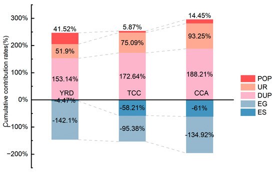 Based on the decomposition analysis of carbon emission drivers across the three urban agglomerations, the results indicate that, overall, economic development, urbanization, and population growth were the primary contributors to carbon emissions during the period from 2005 to 2021. Among these, economic development emerged as the most significant factor, increasing carbon emissions in the YRD, the TCC, and the CCA by 112,507.04 Mt, 78,984.66 Mt, and 322,040.11 Mt, respectively, with contribution rates of 153.14%, 172.64%, and 188.21% (Table 3, Figure 5). In contrast, ES and EG acted as key suppressors of carbon emission growth during the same period, driven by energy structure adjustments, continuous improvements in utilization efficiency, and the implementation of energy-saving and emission-reduction policies. Notably, EG was the most influential carbon suppression factor, contributing to emission reductions in the YRD, TCC, and CCA at rates of 142.10%, 95.38%, and 134.92%, respectively (Figure 5). A comparative analysis of the three urban agglomerations reveals that energy restructuring played a more substantial role in reducing carbon emissions in the TCC and CCA than in the YRD. Conversely, population size contributed the most to carbon emission growth in the YRD, primarily due to its highly developed economy, robust industrial base, rapid urbanization, and strong population absorption capacity. However, the YRD’s relatively low proportion of clean energy sources, such as natural gas and electricity, highlights the need for further adjustments in energy consumption structure and advancements in energy utilization technologies. These remain critical focus areas for future carbon emission reduction efforts in the region [8].