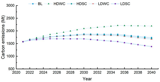 As depicted in Figure 6, the carbon emissions trajectory of the YRD demonstrates a consistent pattern of initial increase followed by a subsequent decline. Overall, the YRD is projected to achieve its carbon peak target between 2025 and 2035. Specifically, under the BL, HDSC, LDWC, and LDSC scenarios, the YRD is expected to reach its carbon peak by 2030. Notably, the LDSC scenario achieves the earliest peak in 2025, with emissions reaching 16.91 × 108 tons. The HDWC scenario is projected to peak in 2035. These findings indicate that achieving the carbon peak by 2030 is feasible for the YRD. According to the BL scenario, maintaining the current levels of economic development and emission reduction measures will result in a deceleration in the rate of carbon emissions, culminating in a peak in 2030. The implementation of more stringent mitigation and carbon reduction measures under the LDSC and HDSC scenarios can effectively slow the growth rate of carbon emissions, thereby enabling earlier peak attainment or a reduction in peak emissions. As China’s most robust economic hub, characterized by comprehensive strength and rapid economic growth, the YRD’s achievement of the carbon peak under the HDSC scenario aligns more closely with its objective requirements. This scenario represents the optimal strategy for balancing economic development with the goal of achieving carbon peak targets.