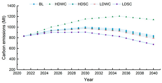 The CCA demonstrates significant temporal variations in carbon peaking across different scenarios, as depicted in Figure 8. Under the BL scenario, the CCA is projected to achieve carbon peaking by 2035, falling short of the 2030 target. In contrast, under the LDSC and HDSC scenarios, carbon peaking is anticipated to occur in 2025 and 2030, respectively, with peak reductions of 13.20% and 8.60% compared to the BL scenario. Notably, under the HDWC scenario, carbon peaking remains unattainable within the 2021–2040 forecast period. These results highlight the critical need for the CCA to maintain a green development pathway, adopt rigorous emission reduction strategies, and implement targeted policies and initiatives. Specifically, accelerating the transition to green and low-carbon energy systems, promoting energy conservation and carbon reduction measures, establishing a sustainable low-carbon product supply chain, and conducting pilot demonstrations of green development practices are essential steps to achieve the 2030 carbon peaking target.