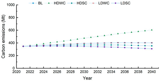 In accordance with China’s carbon reduction policies, the study defines the forecasting period from 2022 to 2040, using 2021 as the baseline year. The parameters for influencing factors are configured based on the five-year planning framework and the varying degrees of development and low-carbon intensity are represented by the growth rates assigned to each respective indicator (Table 6).