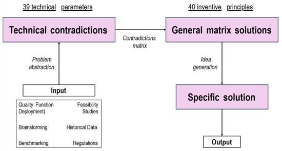 This approach represents how the method is applied to a given problem. After identifying the inputs, features that are intended to be implemented or enhanced in the product, based on methodologies widely discussed in the literature, a decision is made regarding which aspects to improve [34,35,36]. However, at this stage, contradictions may arise when attempting to optimize all parameters simultaneously without adopting compromise solutions. To address this, the process follows the method outlined in the schematic, beginning with problem abstraction, formulating a general question while temporarily disregarding the specific case. The Altshuller matrix is then employed, as explained later, to identify a generalized solution to the defined problem. Once a general solution is found, it must be assessed for applicability to the specific case [37,38].