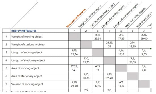 In the TRIZ methodology, technical contradictions are resolved by identifying the key product parameters that exhibit conflicting behaviors. For instance, parameters like weight, speed, capacity and temperature may be subject to trade-offs during the design process. These parameters are represented in the “contradiction matrix”, where the rows correspond to improving features and the columns to deteriorating ones. By finding the intersection of the relevant parameters, a series of numbers corresponding to Altshuller’s 40 inventive principles is generated, offering systematic solutions to the identified contradictions.