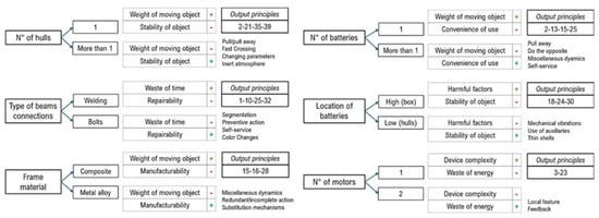 From the analysis of contradictions related to this topic, four inventive principles emerged: pulling away, fast crossing, changing parameters and inert atmosphere (Figure 3). Not all principles demonstrate the same level of relevance: inert atmosphere and fast crossing were deemed unsuitable by the authors for the specific application; on the other hand, the principles of pulling away and changing parameters offer potential avenues for exploration in the drone’s design. This outcome highlights the generalized nature of the conceptual process described here, which retains its abstraction until later stages.