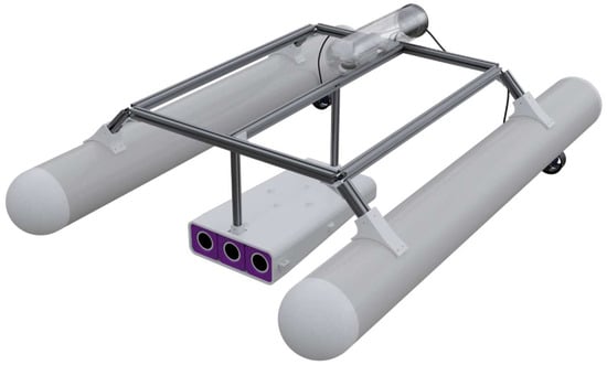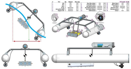 The drone’s stability was evaluated using Siemens NX, where the mass distribution of all components was precisely calculated to optimize the center of gravity and buoyancy; this analysis is reported in Section 3 after illustrating all the components chosen for the drone. The catamaran configuration was selected to enhance stability, reducing roll and pitch under operational conditions. Key design parameters, including hull dimensions and weight placement, were systematically analyzed to ensure balanced flotation and controlled hydrodynamics. While this study focuses on the drone’s overall development and application, a detailed computational analysis of its stability is available in a separate investigation.