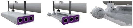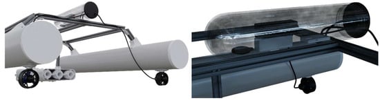 The filtration system employs three parallel filters to ensure continuous functionality. These filters are equipped with nets of varying mesh sizes: 1 mm at the inlet and 0.1 mm at the outlet. This configuration was chosen to capture fragments, including polymer-based particles, within a dimensional range consistent with the technical specifications. The conical design of the filter facilitates the rapid evacuation of processed water, improving operational efficiency. To securely integrate the filter with the drone’s structure, two vertical trabecular elements were incorporated, enabling attachment to the drone’s frame and allowing adjustments to the filter’s immersion depth. A detailed schematic of the filtration system is shown in Figure 6.