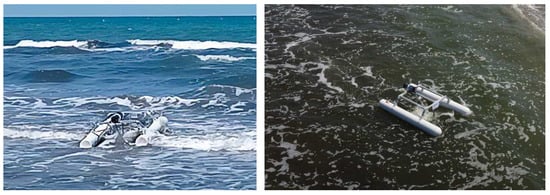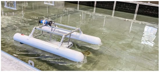The test basin used for the drone’s initial evaluation is capable of generating waves up to 0.5 m in height, simulating the conditions typically encountered in small port environments (Figure 8). During testing, the drone demonstrated stability under these conditions, with the catamaran configuration providing sufficient resistance to tipping. The double-hull design was specifically chosen for its ability to handle small to medium waves typically found in sheltered port environments, ensuring operational stability even when exposed to occasional wave action. While the drone is designed to operate in relatively calm conditions, as expected in port environments, testing with higher waves was conducted to assess its behavior under unexpected disturbances, including lateral currents (Figure 9). These evaluations confirmed that the design maintains stability within the expected range of operational conditions.