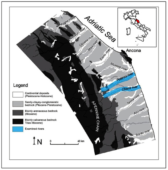 Geological features and main water courses of the Marche region with location of the examined rivers.