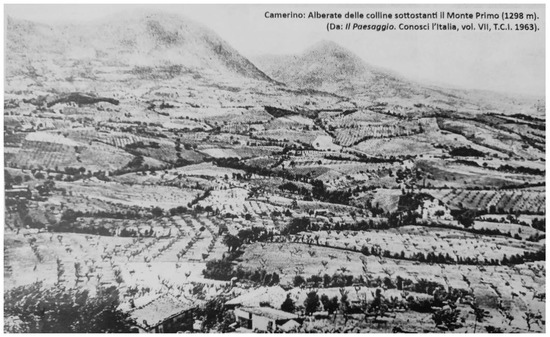 Historical photograph of the rural landscape surrounding the city of Camerino with the characteristic ‘alberata’ cultivations seen in the 1920s and 1930s [54]).