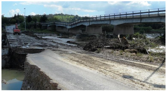 These processes have generated stable slopes, which have caused a drastic decrease in sediments in the main watercourses and thus an increase in their erosive power, together with the proliferation of artificial embankments. Nevertheless, until the late 1950s, phenomena of deepening linear erosion in this area were sporadic. While in the following decades, the substantial stability of riverbeds was compromised by intensive mining of inert materials [55,56,57]. The excavation in the riverbed, carried out almost exclusively in the middle and lower stretches of the rivers, where there were considerable volumes of gravel, caused strong deepening of the riverbed, which, after passing through the alluvium, became embedded for many stretches in the predominantly clayey bedrock of the hilly areas. Over time, the deep incisions caused considerable damage and destruction to the regulation works built in previous periods (artificial embankments, weirs, etc.) and other civil engineering works located along the watercourses or in the sub-river areas (bridges, channels, roads, etc.; Figure 3).