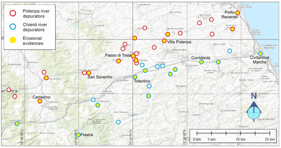 This study considered the geomorphological processes and the anthropic impact of the river environment in the area surrounding sewage treatment plants, both civil and industrial, and also assessed the sustainability of the geological environment. In particular, the situations of 44 plants located in the basins of the Chienti and Potenza Rivers, two watercourses in the Marche region that drain their waters into the Adriatic Sea, were analyzed (Figure 1). The basins of these rivers are conditioned by the geological setting and the regional topographic gradient [7,8,42]. In particular, the Chienti River has a basin area of 1294 km2 and a length of 91 km, while the Potenza River has a basin area of 773 km2 and a length of 88 km.