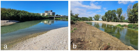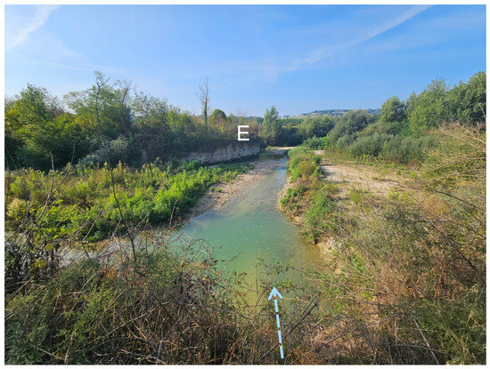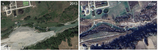 The particularly unstable situation was treated in 2013 with the reclamation works in the area, which included the closure (tombing) of the hydroelectric power plant channel and the protection works (weirs, walls, gabions, etc.) of the banks of the Chienti River near the depurator’s discharge manifold (Figure 15a). About 10 years later, the weirs along the Chienti River are already damaged and erosional phenomena on the left bank are causing obvious collapses in the embankment (Figure 15b).