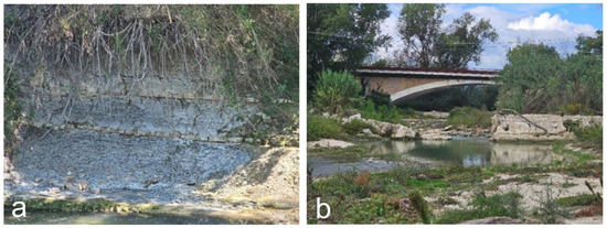 In other situations, again along the middle stretches of the network, the vertical incision of the river has reached the bedrock, which, in these areas, is of a clayey nature, near the Passo di Treia water purification plant (Potenza River; Figure 7a). Here, erosive phenomena are concentrated along the left bank where the plant is located and have exposed discrete stretches of the pelitic bedrock formation. The erosional dynamics are triggered by a weir located just upstream, which has been undermined (Figure 7b). We have found that this type of imbalance in river dynamics also occurs near the San Severino Marche (Potenza River) and Macerata-VillaPotenza (Potenza River) purification plants.