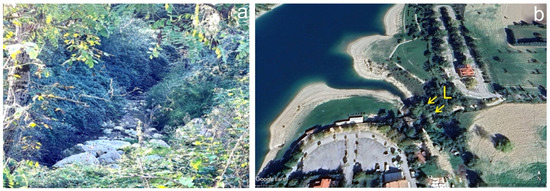 (a) Area in the vicinity of the Camerino wastewater depurator where the blocks in the riverbed result from the collapse of the road above due to bank erosion. (b) Fiastra Lake with the confluence of a tributary where the depurator discharge is connected, triggering erosion and small landslides on the banks (L).