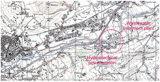 Topographical map edited by the Military Geographical Institute (IGM) of the Tolentino area, modified to obtain the location of the hydroelectrical power station and wastewater treatment plant along the Chienti River.