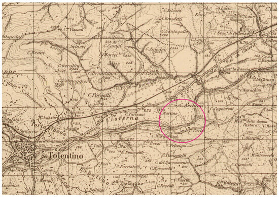 A particular case that we will illustrate in detail is the area surrounding the Tolentino wastewater treatment plant, located downstream from the city in the industrial and commercial area (Figure 4 and Figure 9). The City of Tolentino, like much of the Province of Macerata, underwent considerable economic and demographic development at the beginning of the 1980s, reaching a population of approximately 20,000 inhabitants, and it was then that the need was felt throughout the territory to plan several wastewater treatment plants (Figure 4).