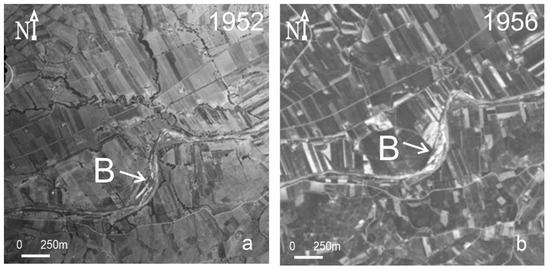 The 1952 and 1956 aerial photographs, which can be consulted by the Italian Military Geographical Institute (IGM), show the area at distinct evolutionary stages (Figure 11a,b). The photo from 1952, about 10 years after the Pianarucci hydroelectric power plant came into operation, shows a riverbed still characterized by several channels and well laced with abundant gravelly debris (light shades). The diversion channel of the hydroelectric power plant is well vegetated up to the confluence with the Chienti River, testifying to a situation of probable hydrodynamic equilibrium. In the aerial photo taken in 1956, downstream of the confluence of the hydroelectric power plant channel with the Chienti River, a heavy accumulation of detrital materials (river bar with whitish tones, Figure 11b) can be seen in the curve of the river, proving that the erosional phenomena on the right bank and those upstream were such as exerting a considerable solid transport.