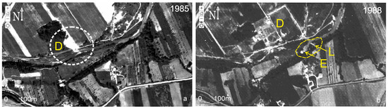 Images (a) before the construction of the plant (D) without evident erosional phenomena and (b) two years after the depurator started operating with regressive erosion (E) and landslide (L) phenomena on the right bank (images after Marche Region aerial photo archive, modified).