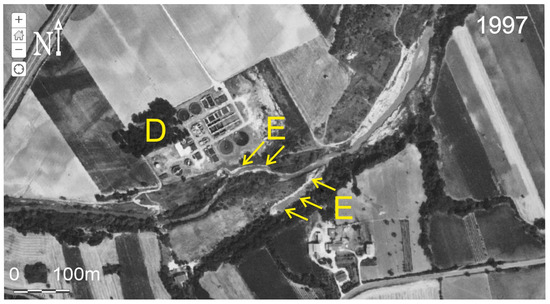 Erosional phenomena (E) in the channel and along the main watercourse in the years following the opening of the second line of the plant (D), while the regressive erosion in the secondary channel retreats up to 120 m (image after Marche Region aerial photo archive, modified).