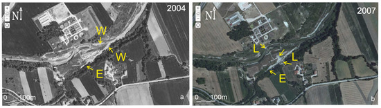 Erosional phenomena with erosion setback of an additional 60 m (E) and widening (W) of channel and of river with deepening between 2004 (a) and 2007 (b) when landslide phenomena (L) also occurred on the banks (images by Marche Region aerial photo archive, modified).