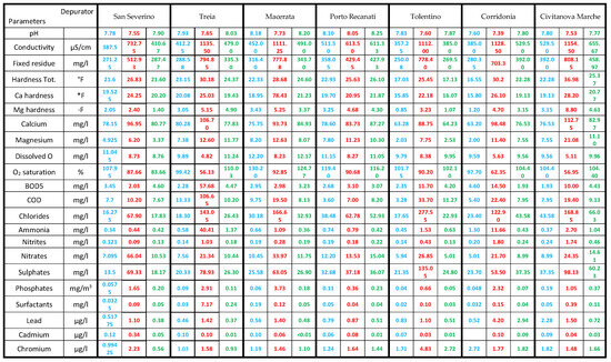 Research on the environmental problems in the considered 44 depurators, as already mentioned, has focused in this first phase on the geomorphological processes of all the plants and in the analysis of the chemical parameters of the main depurators relating to the area’s major population centers. The chemical analyses we conducted (with the support of the Department of Experimental Medicine and Public Health of the University of Camerino) involved water sampling upstream, in the discharge area and downstream of the depurators (Figure 16). These are the plants of San Severino (loc. Pieve), Treia (loc. Passo di Treia), Macerata (loc. Villa Potenza), and Porto Recanati (loc. S. Maria in Potenza) for the Potenza River and Tolentino (loc. Rotondo), Corridonia (loc. Sarrocciano), and Civitanova Marche (Via Fontanelle) for the Chienti River. For the various parameters measured, the averages of the values measured in the recent sampling campaigns carried out in the summer and autumn periods were reported.