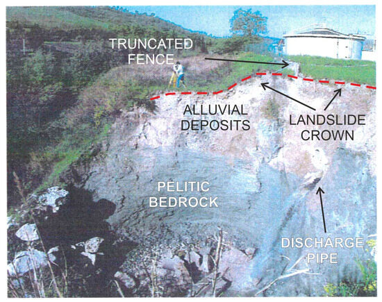 The erosional phenomena, continued throughout the 1990s and most probably the malfunctioning of the purification system in the years 2000–2001 with the leakage of polluted sludge, caused a new acceleration of the erosional processes in the Chienti River and in the adjacent channel, where landslide phenomena also occurred (Figure 17). In order to limit the deepening of the riverbed, three large weirs were built in the Chienti River (Figure 14a), weirs that will soon be undermined by erosional processes. Regressive erosion in the channel progressed almost to the power station (Figure 14b), and, in 2013, a decision was made to restore it by tombing the canal (Figure 15a). Today, about 10 years later, the weirs on the Chienti River show evident damage and, as proof that erosion continues, collapse phenomena are taking place on the left bank, creating strong retreats of the river escarpment, affecting the gravelly alluvium and clays below (Figure 15b).