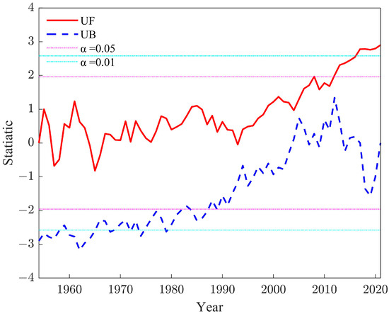 Figure 1 illustrates the annual average runoff variation trend recorded at Kaqun station, indicating significant interannual fluctuation patterns. Higher runoff measurements were documented in both 1994 and 2012, standing above typical values. When analyzed across decades, the overall runoff pattern demonstrates a clear upward trend, with this increasing tendency particularly evident between 1960 and 2000. The mutation test results presented in Figure 2 further confirm this significant upward trend in the time series data. Following 1994, the measurements exhibit a period of relative stability, followed by intensification after 2010, though, intriguingly, no obvious mutation point could be identified throughout the analyzed timeframe.