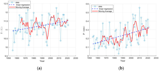 Meteorological trend at Kaqun Station: (a) Temperature Change Trend; (b) Precipitation Change Trend.