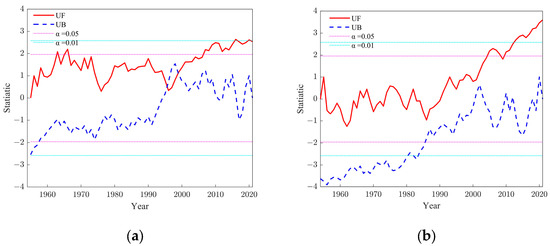 Abrupt change detection of meteorological data at Kaqun Station: (a) Temperature Change Detection Test; (b) Precipitation Change Detection Test.